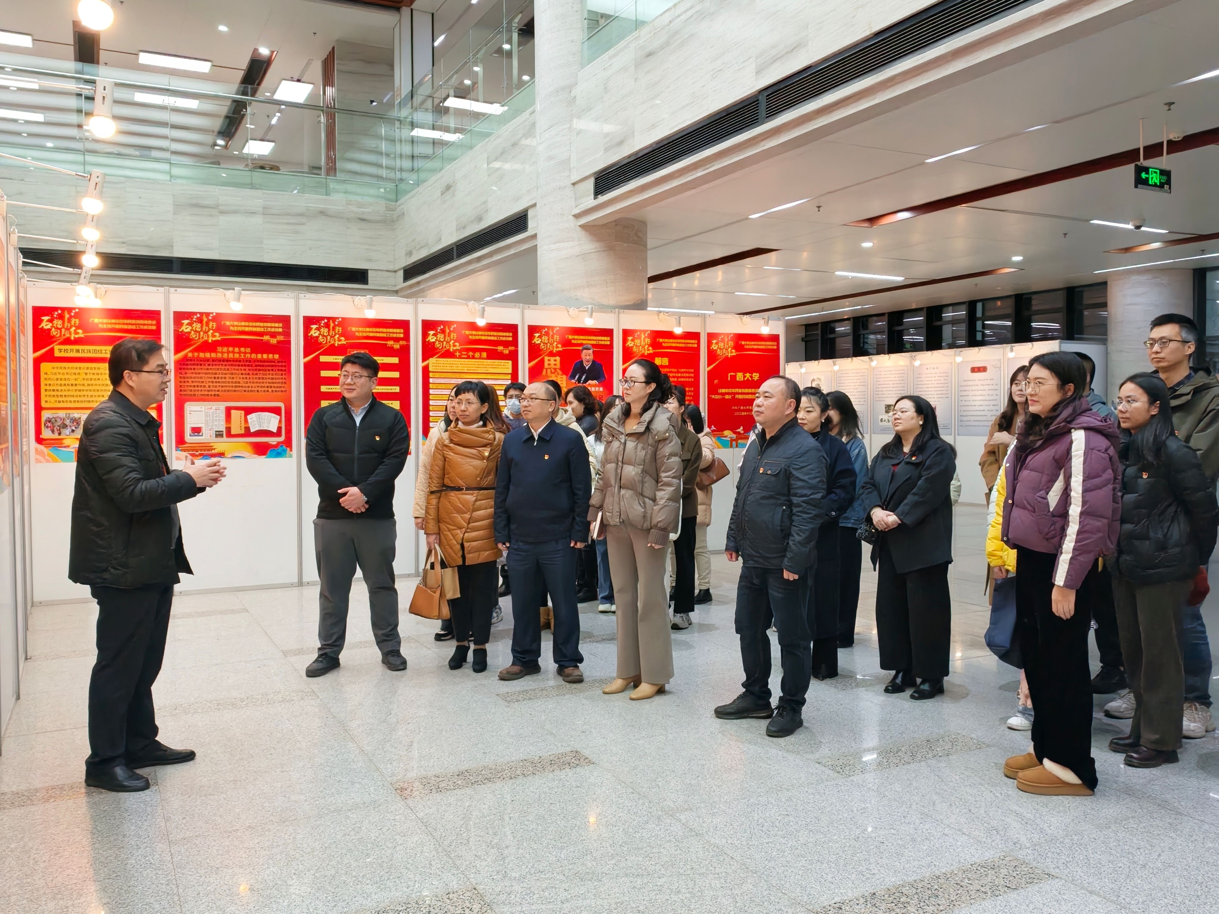 在图书馆,党员同志们认真参观了“墨痕映西大”名家题词展和民族团结教育工作成效展两个展区。通过观看历史展板、聆听生动讲述,大家深入体会了学校厚重的办学底蕴与人文精神,系统学习了以铸牢中华民族共同体意识为主线、推进“大中小一体化”民族团结教育的实践经验与显著成效。
